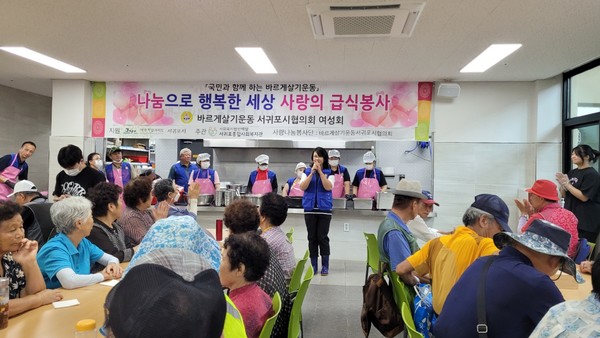 바르게살기운동서귀포시협의회(회장 정철남)는 여성회(회장 채금숙)와 함께 11일 서귀포시종합사회복지관에서 임원 및 회원 20명이 참석한 가운데 어르신 250명을 대상으로 사랑의 급식봉사 활동을 전개했다. 정철남 회장은 "지역 어르신들의 건강을 기원하며 어르신들을 위한 꾸준한 봉사를 펼쳐나가겠다"고 말했다.