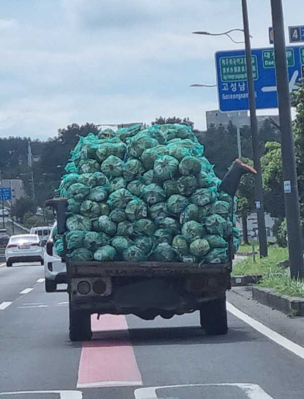 앞서 달리는 차에 시선을 두고 멍하니 달리다 갑자기 눈이 환해지는 풍경을 만났다. 양배추를 실은 트럭의 양옆에 장화가 한쪽씩 깃발처럼 걸려 있는 것이다. 언뜻 보면 트럭에 코를 박은 군인의 장화처럼 보이기도 한다. 뒤에서 하도 빵빵대는 소리에 추월하고 싶은 충동도 있었으나 내 앞에 펼쳐진 극사실화가 왠지 모를 위안이 되어 뒤차들을 무시하기로 한다.