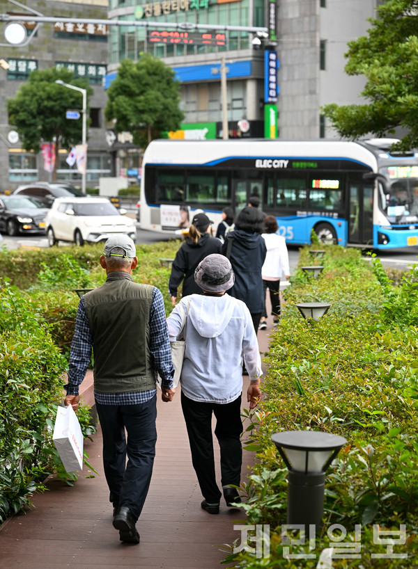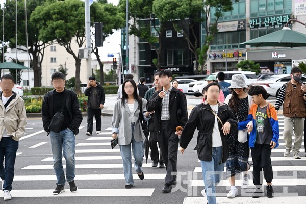 비가 내린 뒤 기온이 떨어져 쌀쌀한 날씨를 보인 3일 오후 제주시 노형오거리에서 긴팔 옷을 입은 도민들이 발걸음을 옮기고 있다.