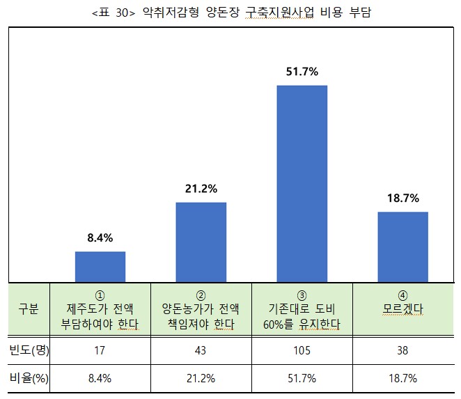 '제주도는 악취저감형 양돈장 구축 지원사업에 도비 60%를 지원하는 것에 대해 어떻게 생각하는가'에 대한 질문에는 '기존대로 도비 60%를 유지해야 한다'는 답변이 51.7%로 과반을 차지했다.