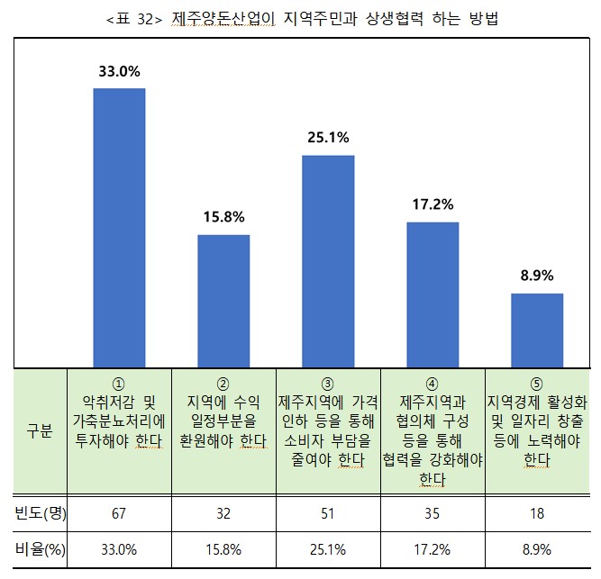 '제주양돈산업이 지역주민과 상생협력하려면 어떻게 해야 하는가' 질문에는 '악취저감 및 가축분뇨처리에 투자해야 한다'는 응답이 33.0%로 가장 우선시됐다.
