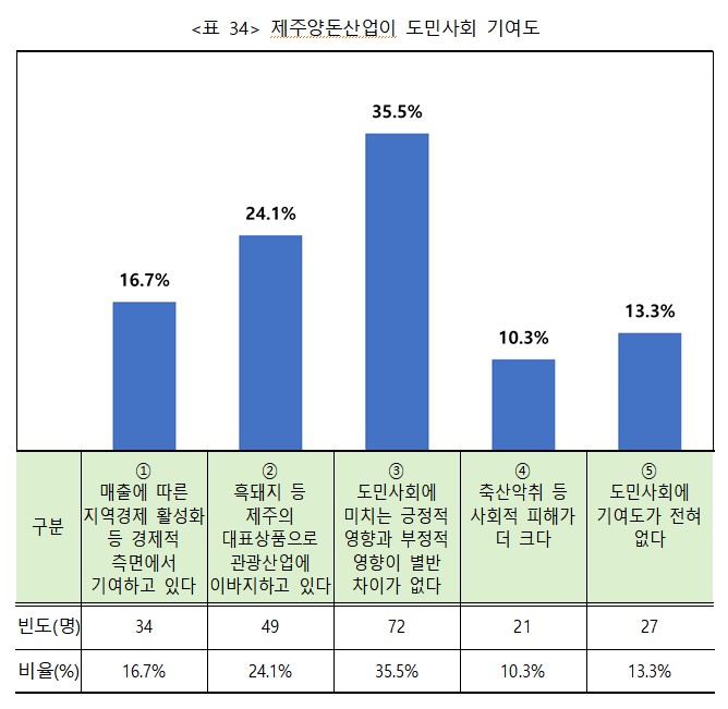 제주도민들은 '제주 양돈산업의 도민사회 기여도는 어떻다고 생각하는가'는 질문에 '도민사회에 미치는 긍정적 영향과 부정적 영향이 별반 차이가 없다'가 35.5%로 가장 많았다.