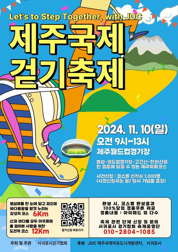 서귀포시걷기협회가 주관, 주최하고 JDC와 서귀포시가 후원하는 2024 제주국제걷기축제가 2024년 11월 10일 9시부터 제주월드컵경기장에서 개최된다. 이번 행사는 JDC 도민지원사업으로 선정돼 JDC와 함께하는 걷기축제로 진행되며, 도민 누구나 참여 가능하다. 또 걷기를 완료한 후 완보 인증도 받을 수 있다.