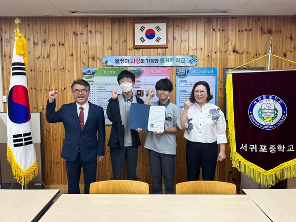 서귀포중학교(교장 고성무) 과학동아리 '호모 사이언피테쿠스'가 14일 열린 2024 제주과학창의대회(동아리 활동 발표회)에서 은상을 수상했다.