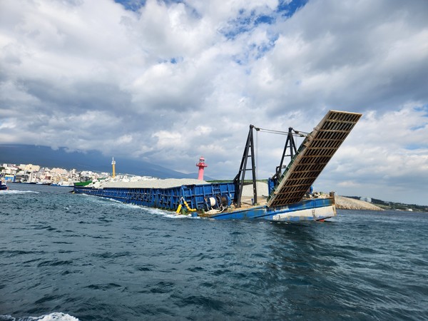 4일 서귀포해양경찰서에 따르면 이날 오전 11시59분께 서귀포항 동방파제 입구에서 인천선적 부선 A호(2213t·승선원 1명)의 좌초가 의심된다는 VTS의 신고가 접수됐다.