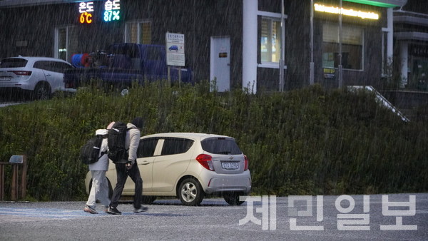 제주 한라산 주요 탐방로 예약제 일시 해제 첫날인 27일 오전 우박이 내리는 등 기상악화로 탐방이 통제되면서 관음사코스 탐방로 주차장을 찾은 탐방객들이 발걸음을 돌리고 있다. 고기욱 기자