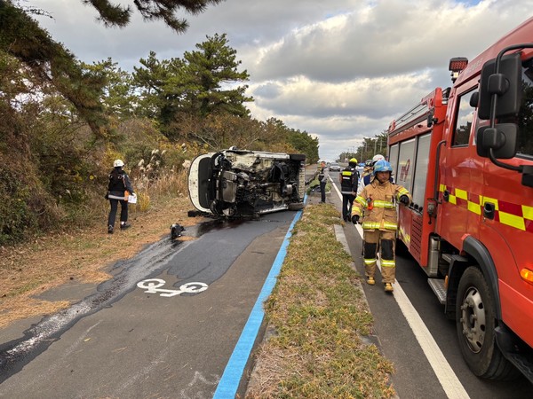 27일 제주소방안전본부에 따르면 이날 오후 3시28분께 제주시 한림읍 금능사거리 일대 도로에서 카니발 차량이 전도됐다는 신고가 접수됐다.