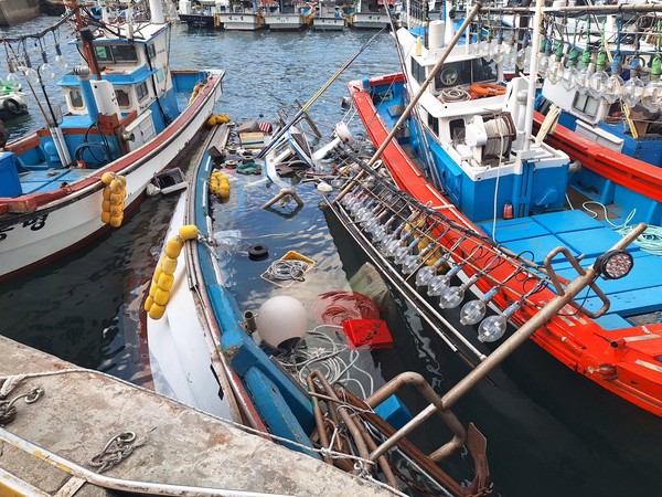 제주의 한 항구에 정박 중인 어선이 침수되는 사고가 발생했다.