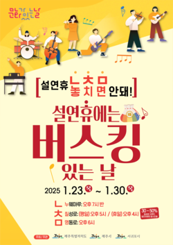 제주도는 설 연휴 기간인 23일부터 30일까지 제주시 누웨마루거리와 칠성로 상점가, 서귀포 명동로에서 문화공연 '설 연휴에는 버스킹 있는 날'을 개최한다고 밝혔다.