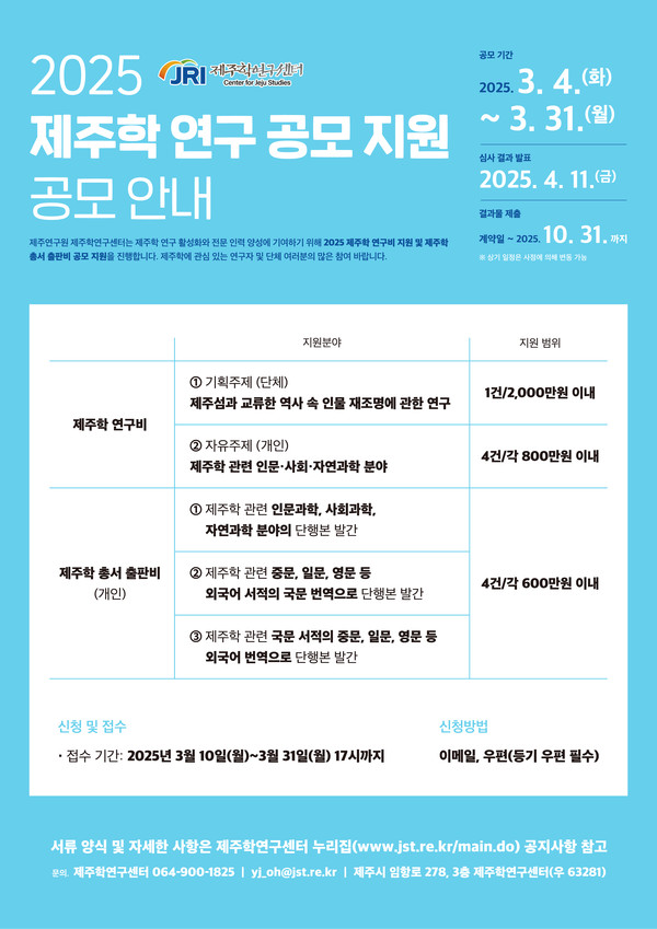 제주학연구센터(센터장 김완병)는 2025년 제주학 연구비 및 총서 출판비 지원을 공모한다고 4일 밝혔다.