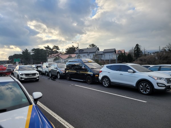 출근 시간대 제주의 한 도로에서 5중 추돌사고가 발생해 차량 정체가 빚어졌다.
