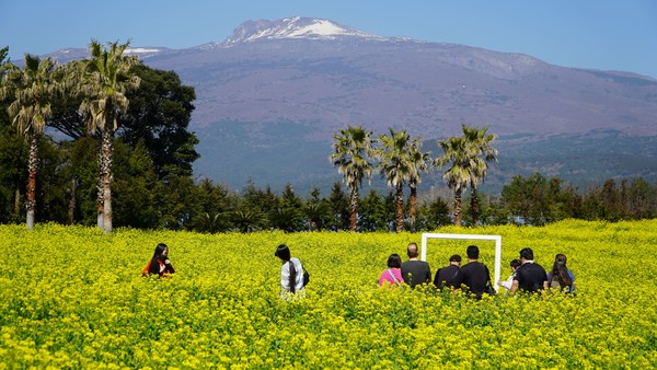서귀포시 남원읍 신례리 휴애리자연생활공원에서 4월 13일까지 '휴애리 유채꽃축제'가 열리는 가운데 방문객들이 화사한 유채꽃을 배경으로 사진을 찍으며 추억을 남기고 있다. 고기욱 기자