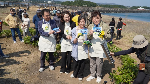 이날 성산읍 주민과 동남초등학교, 성산중학교 학생 등 250여명이 참여한 가운데 2035년 탄소중립을 상징하는 황근 2035그루와 순비기나무 96그루가 식재됐다.