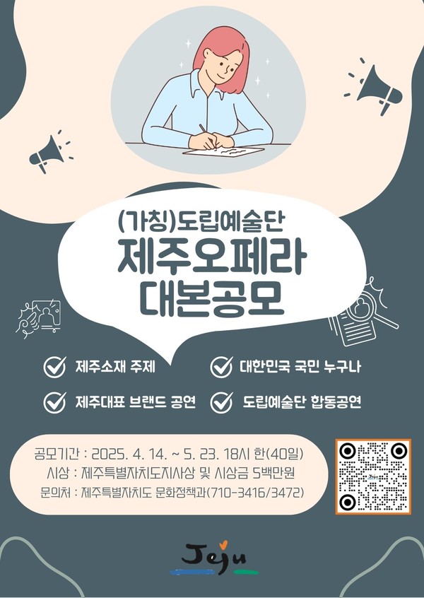 제주도는 제주 대표 창작공연 콘텐츠 개발을 위한 '도립예술단 제주오페라(가칭)' 대본 공모를 오는 14일부터 5월 23일까지 진행한다.
