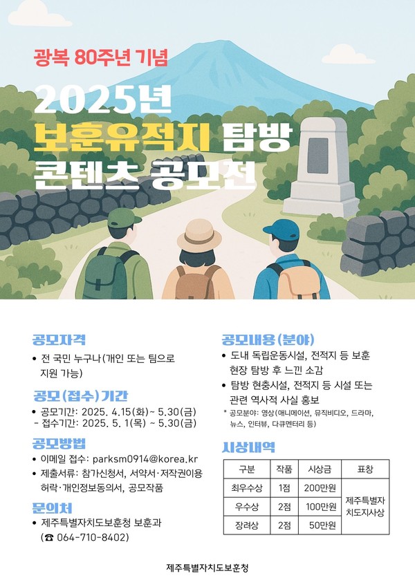 제주도 보훈청(청장 배태미)은 다음달 한 달간 2025년 보훈유적지 탐방 콘텐츠 공모전 작품 접수를 받고 있다고 22일 밝혔다.