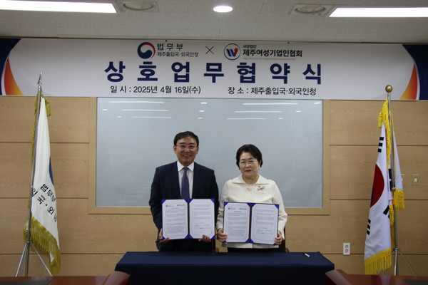 법무부 제주출입국·외국인청(청장 박재완)과 (사)제주여성기업인협회(회장 백희순)는 최근 외국인 국내정착 및 인재양성을 위한 업무협약을 체결했다.