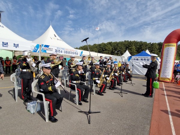 해병대 제9여단 군악대는 지난 27일 제주대학교 운동장에서 열린 '2025 평화의섬 제주 국제마라톤대회'에서 개막식에 함께하는 한편, 대회의 시작을 알리는 연주를 진행했다.