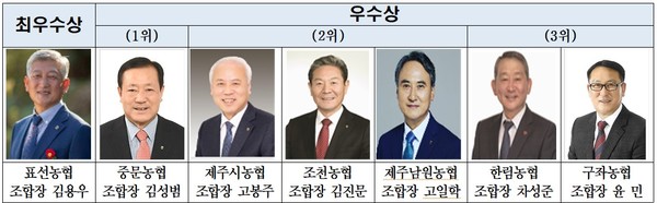 또한 제주시농협(조합장 고봉주)과 조천농협(조합장 김진문), 제주남원농협(조합장 고일학)은 우수상 2위에 올랐으며 한림농협(조합장 차성준), 구좌농협(조합장 윤민)은 우수상 3위를 수상했다.