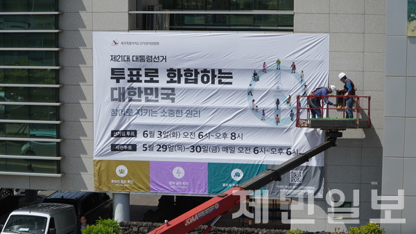 8일 오전 제주시 이도2동 제주도선거관리위원회 동측 벽면에 제21대 대통령 선거 투표참여를 독려하는 대형 현수막 게시 작업이 이뤄지고 있다. 고기욱 기자 고기욱 기자 kku9915@gmail.com 다른기사 보기 저작권자 © 제민일보 무단전재 및 재배포 금지 댓글삭제 삭제한 댓글은 다시 복구할 수 없습니다. 그래도 삭제하시겠습니까? 비밀번호 닫기 기사 댓글 0 댓글 접기 댓글입력 권한이 없습니다. 댓글 내용입력 비회원 로그인 이름 비밀번호 댓글 내용입력 댓글쓰기 계정을 선택하시면 로그인·계정인증을 통해 댓글을 남기실 수 있습니다. 회원 로그인 이름 비밀번호 자동등록방지 로그인 옵션 창닫기