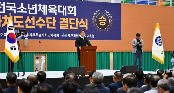 행사는 해병대 제9여단 군악대가 함께하는 국민의례와 신진성 도체육회장의 개회사, 김애숙 제주도 정무부지사의 격려사에 이어 이상봉 제주도의회 의장, 김광수 제주도교육감의 격려사와 강경훈 총감독의 출정보고 순으로 진행했다.