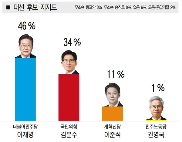 '누가 대통령이 되는 것이 가장 좋다고 생각하십니까'라는 질문에 이재명 후보가 46%, 김문수 후보가 34%, 이준석 후보가 11%로 조사됐다. 민주노동당 권영국 후보는 1%, 없다는 6%, 응답거절은 2%다.