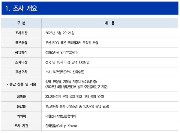 제민일보를 비롯해 전국의 유력 지역일간지 29개사로 구성된 대한민국지방신문협의회(이하 대신협)는 국내 여론조사 전문기관 한국갤럽조사연구소에 의뢰해 지난 20일부터 21일까지 만 18세 이상 전국 남녀 1007명을 대상으로 전화조사원 인터뷰(CATI)를 통한 대통령 후보 지지도 조사를 실시했다.