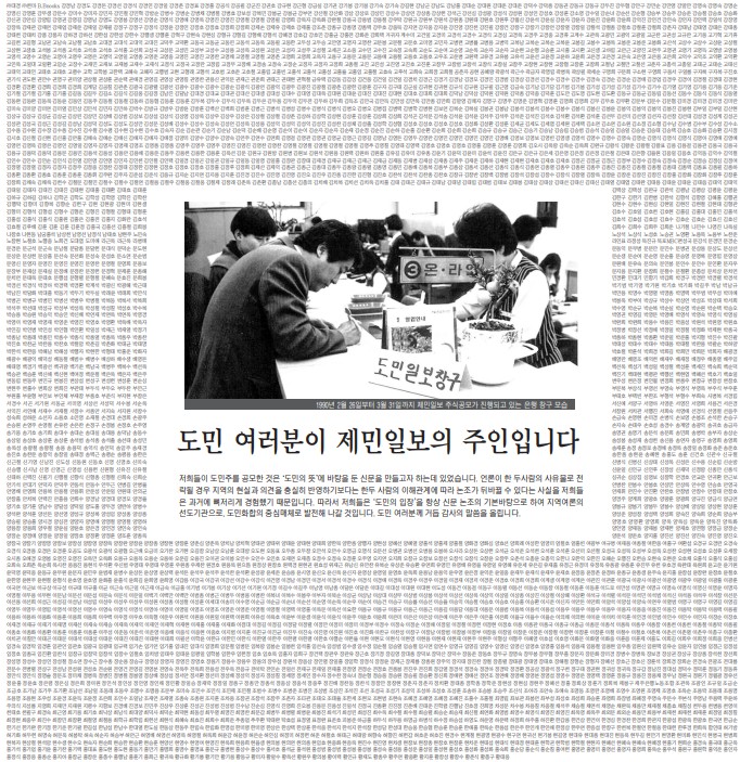 저희들이 도민주를 공모한 것은 도민의 뜻에 바탕을 둔 신문을 만들고자 하는데 있었습니다. 언론이 한 두사람의 사유물로 전락될 경우 지역의 현실과 의견을 충실히 반영하기보다는 한두사람의 이해관계에 따라 논조가 뒤바뀔 수 있다는 사실을 저희들은 과거에 뼈저리게 경험했기 때문입니다. 따라서 저희들은 도민의 입장을 항상 신문 논조의 기본바탕으로 하여 지역여론의 선도기관으로, 도민화합의 중심매체로 발전해 나갈 것입니다. 도민 여러분께 거듭 감사의 말씀을 올립니다.