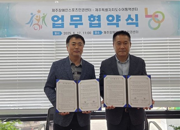 제주장애인스포츠인권센터(센터장 양용석)는 지난 17일 제주특별자치도수어통역센터(센터장 민태희)와 청각장애인 인권 보장 및 체육활동 참여 확대를 위한 업무협약을 체결했다.