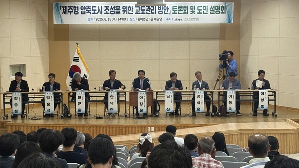 제주도는 18일 농어업인회관 대강당에서 '제주형 압축도시 조성을 위한 고도관리 방안 수립 용역' 토론회 및 도민 설명회를 개최했다.