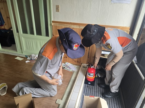성산읍 의용소방대원들은 각 가정을 방문해 소화기 전달 및 단독경보형 감지기를 달아 주면서 어르신들을 상대로 소화기 사용법을 함께 교육을 병행했다.