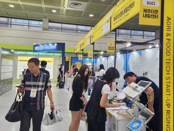 농림축산식품부가 주최하고 한국농업기술진흥원, NH농협, 코엑스가 주관하는 '농식품 테크 스타트업 창업박람회'가 16일 서울 COEX 전시장 C홀에서 열린 가운데 제주더큰내일센터(센터장 이승우)와 '탐나는 인재' 창업기업인 커스티(대표 한주희), 스코비아일랜드(대표 강상경), 핏플(대표 서성용) 등 3곳이 제품 판매를 위한 홍보 부스를 운영하고 있다. 양경익 기자