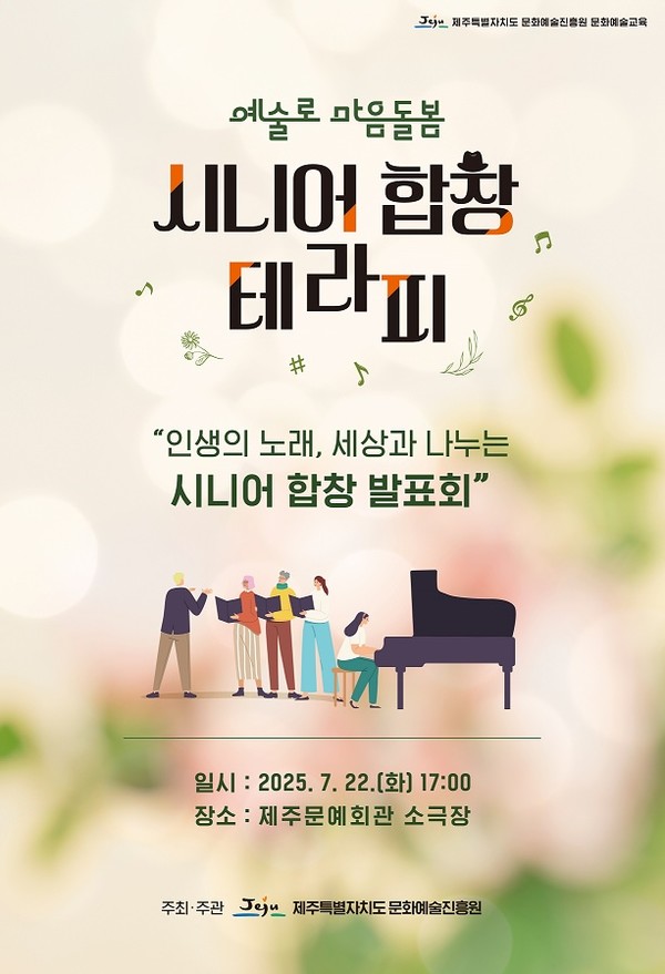제주도 문화예술진흥원은 22일 오후 5시 문예회관 소극장에서 ‘예술로 마음돌봄–시니어합창테라피’ 발표회를 개최한다고 20일 밝혔다.