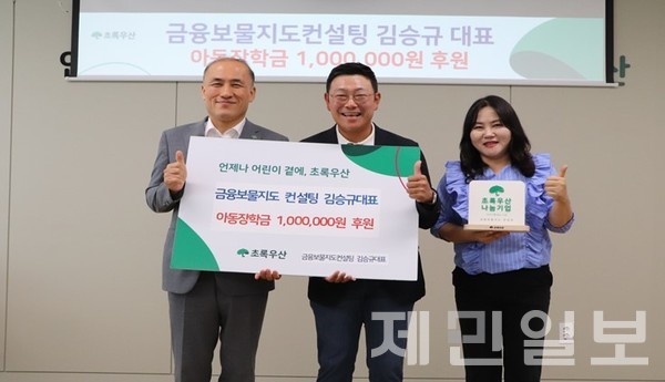 김승규 금융보물지도 컨설팅 대표는 최근 아동 장학금 100만원을 초록우산 제주지역본부(본부장 김희석)에 전달했다.