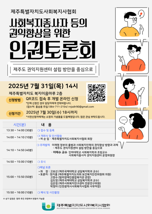 제주특별자치도사회복지사협회는 오는 31일 오후 2시 제주복지이음마루에서 ‘제주도 내 사회복지사 권익향상을 위한 인권토론회’를 개최한다고 27일 밝혔다.