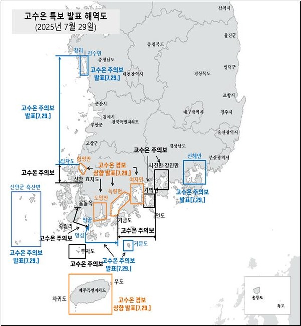 국립수산과학원은 29일 제주 연안과 전남 4개 내만(함평만, 도암만, 득량만, 여자만)에 고수온 특보 ‘경보’를 발표하고 서해 중부와 남해 서부 연안, 거문도와 흑산도 해역, 천수만과 진해만 등 9개 해역에는 고수온 주의보를 발령했다.