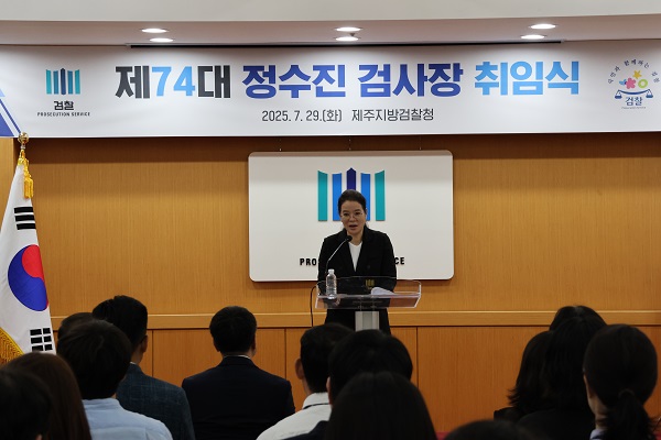 정수진 제주지검장은 29일 열린 취임식에서 "검찰의 존재 이유는 오직 법률과 양심에 따라 객관적이고 중립적인 입장에서 법을 집행하고 이를 통해 국민의 생명과 안전, 재산 등 기본권을 수호하는 것"이라며 "검찰 본연의 업무에 최선을 다해 국민의 신뢰를 받는 검찰이 돼야 한다"고 밝혔다.