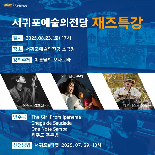 특히, 라라랜드, 사랑은 비를 타고 등 대중적인 사랑을 받은 재즈 영화 연주와 One Note Samba 등 대표적인 보사보나 명곡들을 함께 감상할 수 있다. 인문예술 두 번째 강좌는 9월 20일 오후 5시 이종원 여행작가의 '여행은 길 위의 학교'의 주제로 바쁜 일상을 살아가는 시민들의 여행을 통해 배우는 지혜와 힐링 등 삶의 활력을 충전하기 위한 여행 인문학을 개최한다. 8월 미술사와 재즈 인문학 강좌 참여방법은 7월 29일부터 서귀포e티켓으로 신청할 수 있으며 관람료는 무료로 자세한 내용은 서귀포예술의전당 홈페이지(https://culture.seogwipo.go.kr/artcenter/index.htm) 를 통해 확인할 수 있다.