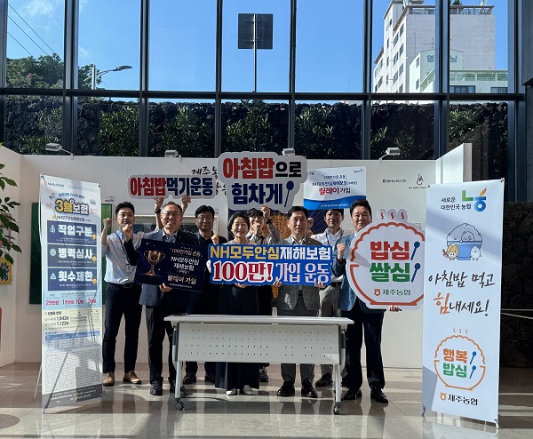 이에 NH농협생명 제주총국은 이날 신상품 가입 행사를 개최한 가운데 고우일 농협중앙회 제주본부장과 고은정 NH농협은행 제주본부장이 각각 'NH 모두 안심 재해보험' '심플한 NH 재해보험'에 1호로 가입했다.