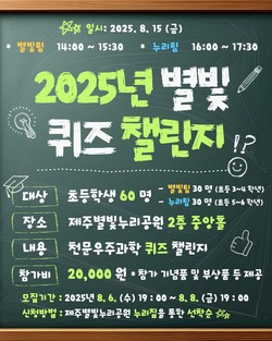 이와 함꼐 오는 15일에는 천문우주 상식을 퀴즈로 풀어보는 어린이 참여형 행사 ‘별빛퀴즈 챌린지’가 제주별빛누리공원 2층 중앙홀에서 열린다.