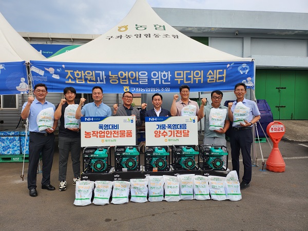 이들은 당근 파종에 어려움을 겪고 있는 구좌지역에 양수기 28대를 긴급 지원했으며 도내 취약 농업인을 대상으로 농협중앙회가 지원한 폭염 대비용 넥쿨러 300개와 쿨링 키트 100개, 농협재단이 지원한 휴대용 냉방기기 120개도 함께 지급했다.