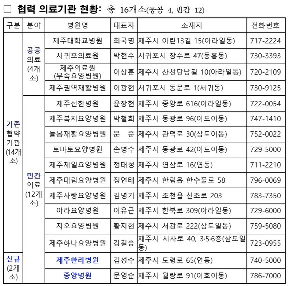 제주도는 퇴원환자 안심 재가 복귀지원 사업 확대를 위해 민간 의료기관인 중앙병원, 제주한라병원과 업무협약을 체결했다고 11일 밝혔다. 이번 협약 체결로 도내 협력 의료기관은 모두 16곳(공공 4, 민간 12)이다.