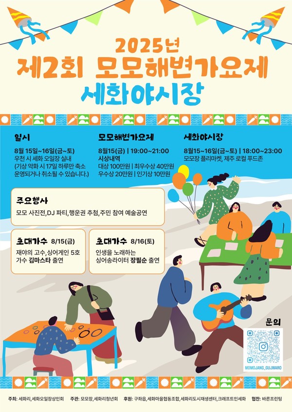 세화리마을회, 청년회, 모모장 주관의 이번 축제는 모모해변가요제 및 초대가수 공연과 DJ 파티, 플리마켓, 제주로컬푸드존, 전시회 등이 어우러진 다채로운 콘텐츠로 구성된다.