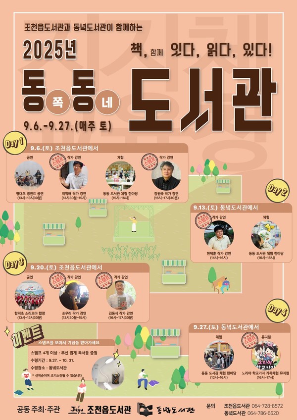 행사는 조천읍도서관(9월 6일·20일)과 동녘도서관(9월 13일·27일)에서 총 4회에 걸쳐 작가 초청 강연, 공연, 체험 프로그램, 전시, 이벤트 등이 진행된다.