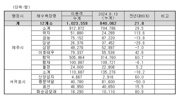 지역별로는 제주시 8개 해수욕장에 91만 2872명이 몰렸고, 서귀포시 4개 해수욕장에는 11만 687명이 다녀갔다.
