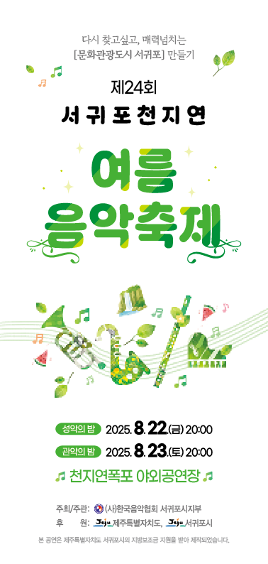 한국음악협회 서귀포지부(지부장 이봉훈)는 오는 22~23일 천지연폭포 야외광장에서 제24회 서귀포천지연 여름 음악축제를 선보인다.