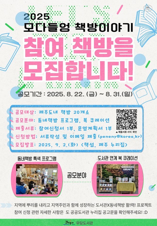 우당도서관이 지역 독서 생태계 활성화를 위해 ‘2025 모다들엉 책방 이야기’ 참여 동네책방을 8월 31일까지 모집한다.