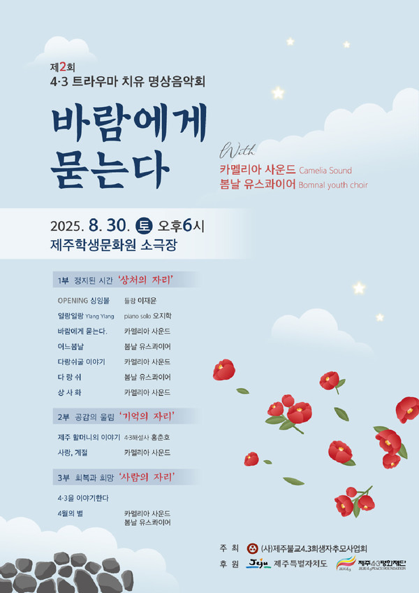 제주불교4·3희생자추모사업회는 "음악은 사람의 마음을 움직이고, 슬픔을 덜어내며, 평화와 행복을 추구하게 한다"며 "이번 음악회가 단순한 위로를 넘어 감정 정화와 공감, 그리고 희망을 나누는 시간이 되길 바란다"고 말했다.