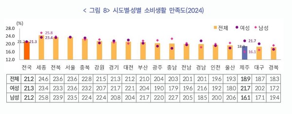 소비생활 만족도는 18.9%로 전국 평균 21.2%에 못미치며 17개 시·도 가운데 15위에 머물렀다.
