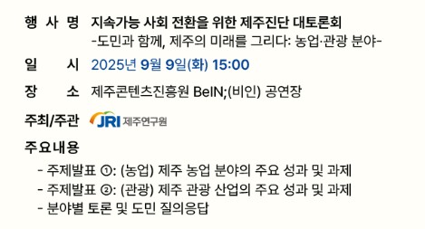 이날 토론회 주제는 '1차산업과 관광산업의 전환 및 미래 지속성장'으로, 안경아 연구위원의 '제주 농업의 주요 성과와 향후 과제', 신학승 한양대학교 관광학부 교수의 '제주 관광산업의 성과 및 향후 과제' 발표가 이뤄진다.