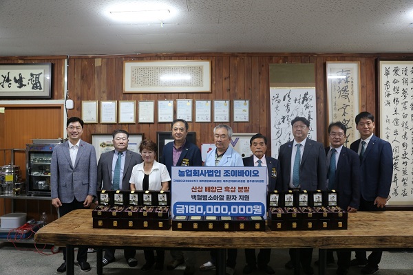 농업회사법인 조이바이오(유)(대표 김철균)는 25일 조이바이오 사무실에서 1억8000만원 상당의 산삼배양 제품을 제주사회복지공동모금회(회장 강지언)에 기탁했다.